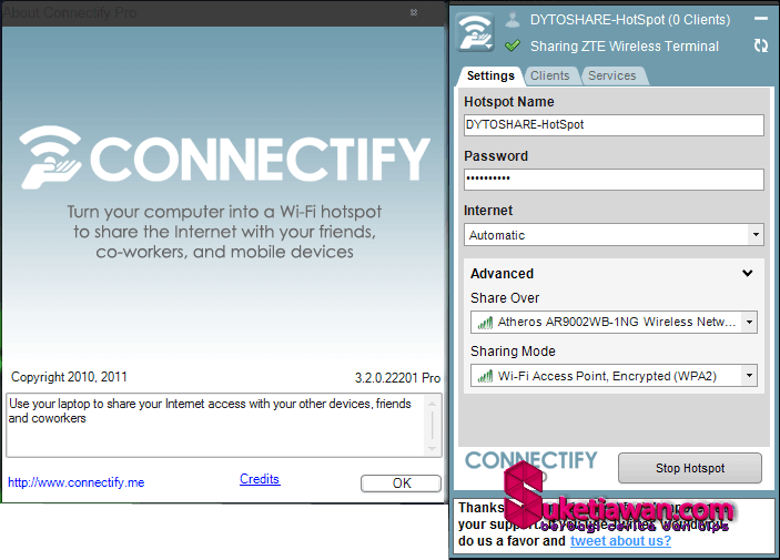 Connectify : Merupakan software yang membantu dalam kinerja jaringan komputer dan dengan software ini dapat mempermudah kamu dalam membagi koneksi internet, ad-hoc dan media file serta beragam macam lainnya. Kelebihan software ini, mudah digunakan disaat anda bingung dalam merakit jaringan ad-hoc ataupun sharing internet ke sesama client, dan lebih menguntungkannya lagi, software ini kamu bisa membuat Laptop/komputer menjadi sebuah accespoint atau pusatnya koneksi untuk client yang menggunakan jaringan komputer wireless atau WIFI, juga bisa membantu koneksi sinyal accespoint kamu menjadi kuat dengan metode repeater dan memanfaatkan Wifi laptop atau wifi card yang sudah dipasang di PC kamu, saya sudah membuktikannya dan hasilnya memuaskan apalagi ditambahkan lagi versi Proffesional sehingga fitur yang di inginkan sangat lengkap dan maksimum.