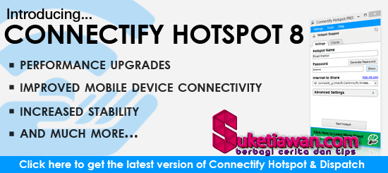 Pernah mendengar software yang satu ini?? Connectify 8 Hotspot Pro adalah sebuah software yang berfungsi untuk membagikan koneksi internet. Dengan bantuan software ini, kita bisa membuat WiFi langsung menggunakan laptop ataupun komputer. Selain itu, Connectify ini juga mampu menggabungkan 2 koneksi berbeda sehingga kita bisa mendapatkan koneksi gabungan yang jauh lebih cepat. Software ini sangat berguna nih buat sobat yang pengen share koneksi dari laptop ke smartphonenya. Pastinya gak pake ribet dan mudah untuk digunakan.