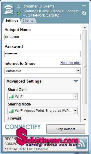 Untuk mengatasi hal tersebut, baiknya Anda update terlebih dahulu driver network wi fi di komputer Anda sebelum menginstall connectify. Bila connectify sudah terlanjur terinstall dikomputer Anda, uninstall program ini dengan menggunakan revouninstaller. Setelah itu update driver Anda menggunakan software slimdriver. Silahkan download slimdriver melalui 4shared di sini