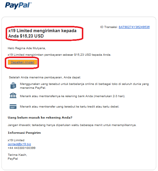 Terlihat email tersebut mengatakan bahwa x19 Limited telah mengirimkan kepada saya $15,23 USD. Tapi kenapa kok bukan dari Adf.ly? Lalu saya pun mengklik tombol “Dapatkan rincian” yang terdapat pada email tadi. Dan ternyata memang Adf.ly lah yang telah mengirim pembayaran pada akun paypal saya sebesar $15,23 USD.
