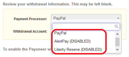 3. Isi withdrawal information. Pada payment processor, pilih metode pembayaran. Saat ini Adf.ly menyediakan tiga metode pembayaran yaitu Paypal, Alertpay, dan Liberty Reserve. Pilih metode yang sobat sukai.